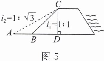 例 1 (2022 湖南郴州中考)图 5 是某水库大坝的横截面,坝高$CD = 20$m,背水坡$BC的坡度为i_1 = 1:1$。为了对水库大坝进行升级加固,降低背水坡的倾斜程度,设计人员准备把背水坡的坡度改为$i_2 = 1:\sqrt{3}$。求背水坡新起点$A与原起点B$之间的距离。(结果精确到$0.1$m;参考数据:$\sqrt{2}\approx1.41$,$\sqrt{3}\approx1.73$)