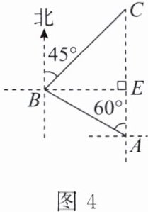 4. 如图 4,小明一家驾车到古镇$C$游玩,到达$A$地后,导航显示该车辆应沿北偏西$60^{\circ}方向行驶6$km 至$B$地,再沿北偏东$45^{\circ}方向行驶一段距离到达古镇C$。小明发现古镇$C恰好在A$地的正北方向,他过点$B作BE\perp AC于点E$,则$BE= $______km,$\angle C= $______$^{\circ}$,$BC= $______km。