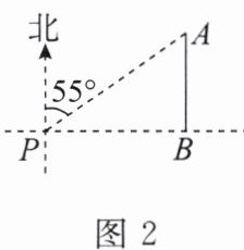 2. 如图 2,一艘海轮位于灯塔$P的北偏东55^{\circ}方向的A$处,$PA = 6$n mile。若海轮沿正南方向航行到灯塔$P$的正东方向,则海轮航行的距离$AB$是( )。