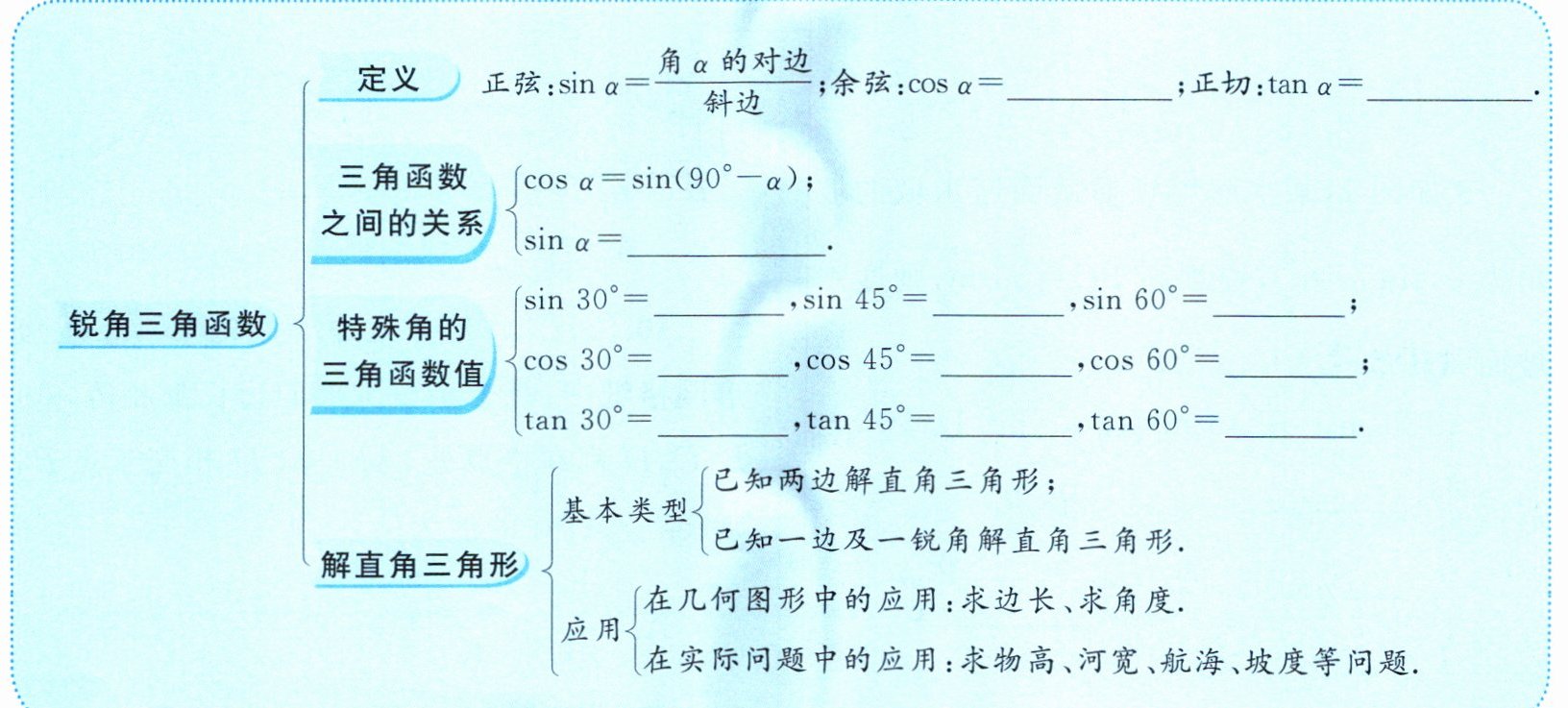 $\frac{角\alpha的邻边}{斜边}$;$\frac{角\alpha的对边}{角\alpha的邻边}$;$\cos(90^{\circ}-\alpha)$;$\frac{1}{2}$;$\frac{\sqrt{2}}{2}$;$\frac{\sqrt{3}}{2}$;$\frac{\sqrt{3}}{2}$;$\frac{\sqrt{2}}{2}$;$\frac{1}{2}$;$\frac{\sqrt{3}}{3}$;$1$;$\sqrt{3}$