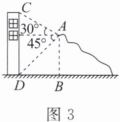 8. 如图 3,在高度为 $30\ m$ 的小山 $A$ 处测得建筑物 $CD$ 的顶部 $C$ 的仰角为 $30°$,底部 $D$ 的俯角为 $45°$,则建筑物 $CD$ 的高度为( )。