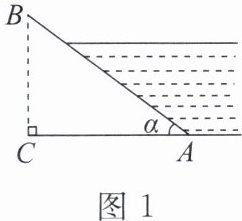 5. 如图 1,某水库堤坝横截面迎水坡的坡角为 $\alpha$,$\sin \alpha = \frac{3}{5}$,堤坝高 $BC = 30\ m$,则迎水坡面 $AB$ 的长为( )。