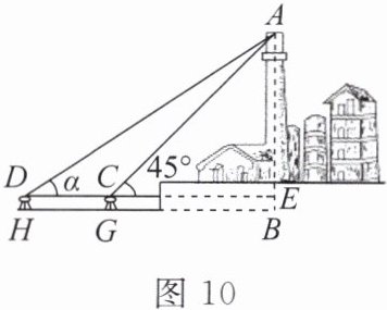 16. (14 分) (2022 内蒙古包头中考) 如图 10,$AB$ 是底部(点 $B$)不可到达的一座建筑物,$A$ 为建筑物的最高点,测角仪的高 $DH = CG = 1.5\ m$。某数学兴趣小组为测量建筑物 $AB$ 的高度,先在 $H$ 处用测角仪测得建筑物顶端 $A$ 的仰角 $\angle ADE$ 为 $\alpha$,再向前走 $5\ m$ 到达 $G$ 处,测得建筑物顶端 $A$ 的仰角 $\angle ACE$ 为 $45°$。已知 $\tan \alpha = \frac{7}{9}$,$AB \perp BH$,$H$,$G$,$B$ 三点在同一水平线上。求建筑物 $AB$ 的高度。