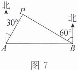 13. 如图 7,一艘船以 $40\ n mile/h$ 的速度由西向东航行,航行到 $A$ 处时,测得灯塔 $P$ 位于船的北偏东 $30°$ 方向;继续航行 $2.5\ h$,到达 $B$ 处,测得灯塔 $P$ 位于船的北偏西 $60°$ 方向,则船行到 $B$ 处时与灯塔 $P$ 的距离为____$n mile$(结果保留根号)。