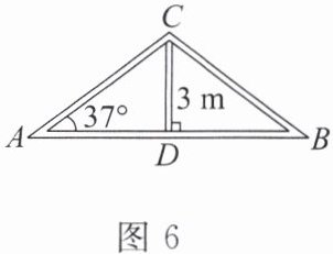 12. (2023 广西中考) 如图 6,焊接一个钢架,包括底角为 $37°$ 的等腰三角形外框和 $3\ m$ 高的支柱,则共需钢材约____$m$。(结果取整数;参考数据:$\sin 37° \approx 0.60$,$\cos 37° \approx 0.80$,$\tan 37° \approx 0.75$)