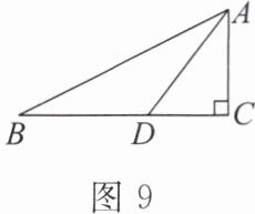 15. (14 分) 如图 9,在 $Rt \triangle ABC$ 中,$\angle C = 90°$,$BC = 8$,$\tan B = \frac{1}{2}$,点 $D$ 在 $BC$ 上,且 $BD = AD$。
