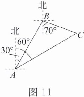 17. (16 分) (2022 辽宁锦州中考) 如图 11,一艘货轮在海面上航行,准备要停靠到码头 $C$,货轮航行到 $A$ 处时,测得码头 $C$ 在北偏东 $60°$ 方向上。为了躲避 $A$,$C$ 两处之间的暗礁,这艘货轮调整航向,沿着北偏东 $30°$ 方向航行,到 $B$ 处后,又沿着南偏东 $70°$ 方向航行 $20\ n mile$ 到达码头 $C$。求货轮从 $A$ 处到 $B$ 处航行的距离。(结果精确到 $0.1\ n mile$;参考数据:$\sin 50° \approx 0.766$,$\cos 50° \approx 0.643$,$\tan 50° \approx 1.192$)