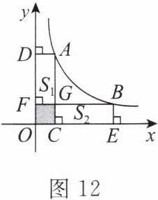 2. 如图 12,过双曲线 $ y = \frac{3}{x} $ 上的 $ A $,$ B $ 两点分别向 $ x $ 轴、$ y $ 轴作垂线,垂足分别为点 $ C $,$ D $,$ E $,$ F $,$ AC $ 与 $ BF $ 相交于点 $ G $,矩形 $ ADFG $ 和矩形 $ BECG $ 的面积分别为 $ S_1 $,$ S_2 $,若阴影部分的面积为 $ 1 $,则 $ S_1 + S_2 = $______。