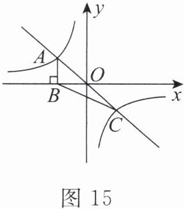 如图 15,正比例函数 $ y = kx $ 与反比例函数 $ y = -\frac{4}{x} $ 的图象相交于 $ A $,$ C $ 两点,过点 $ A $ 作 $ x $ 轴的垂线,垂足为点 $ B $,连接 $ BC $,则 $ \triangle ABC $ 的面积为( )。
