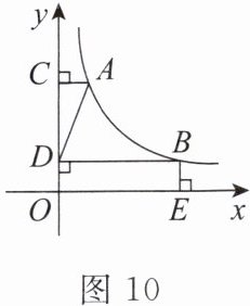 如图 10,反比例函数 $ y = \frac{k}{x} $($ x > 0 $)的图象经过 $ A $,$ B $ 两点,过点 $ A $ 作 $ AC \perp y $ 轴于点 $ C $,过点 $ B $ 作 $ BD \perp y $ 轴于点 $ D $,$ BE \perp x $ 轴于点 $ E $,连接 $ AD $。已知 $ AC = 1 $,$ BE = 1 $,矩形 $ BDOE $ 的面积为 $ 4 $,则 $ \triangle ACD $ 的面积为______。