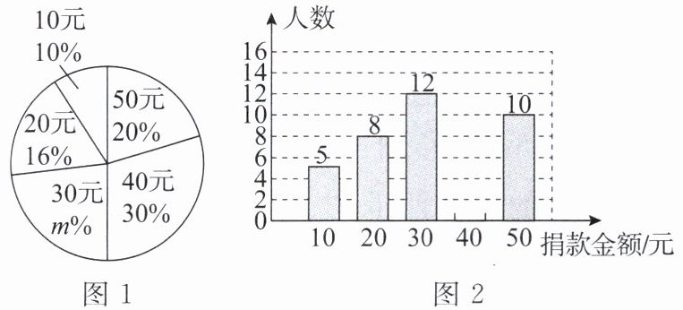 (1)50 24 提示:由条形图可知,捐款金额为10元的有5人,由扇形图可知,捐款金额为10元的占10%,则本次接受调查的居民共有$5÷10\% =50$(人).因为$1-10\% -16\% -30\% -20\% =24\% $,所以$m=24$.