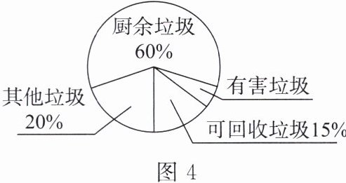 14. 小明为了解所在小区居民各类生活垃圾的投放情况,随机调查了该小区$100$户家庭某一天各类生活垃圾的投放量,统计得出这$100户家庭各类生活垃圾的投放总量为250\ kg$,各类生活垃圾投放量分布情况如图$4$.根据以上信息,估计该小区$500$户居民这一天投放的有害垃圾约为______$kg$.