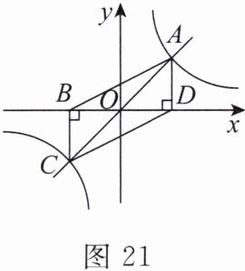 如图 21,点 $ A $,$ C $ 分别是正比例函数 $ y = x $ 与反比例函数 $ y = \frac{4}{x} $ 图象的交点,过点 $ A $ 作 $ AD \perp x $ 轴于点 $ D $,过点 $ C $ 作 $ CB \perp x $ 轴于点 $ B $,则四边形 $ ABCD $ 的面积为______。