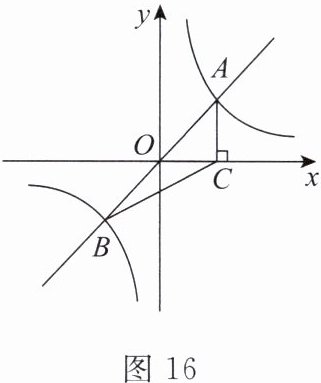 3. (2023 辽宁阜新中考)如图 16,正比例函数 $ y = x $ 与反比例函数 $ y = \frac{5}{x} $ 的图象相交于 $ A $,$ B $ 两点,过点 $ A $ 作 $ AC \perp x $ 轴,垂足为点 $ C $,连接 $ BC $,则 $ \triangle ABC $ 的面积是______。