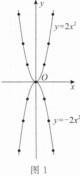 (4) 如图 1,用同样的方法在同一坐标系中画出函数 $ y = 2x^2 $ 的图象。从图 1 可以看出,函数 $ y = 2x^2 $ 的图象开口向上,对称轴是 $ y $ 轴,顶点坐标是 $ (0,0) $;当 $ x = 0 $ 时,函数有最小值,其值是 0;函数 $ y = -2x^2 $ 的图象与函数 $ y = 2x^2 $ 的图象关于 $ x $ 轴对称。