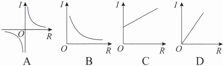 1. (跨学科)电压 $ U $(V)、电流 $ I $(A)和电阻 $ R $(Ω)三者之间的关系是 $ I = \frac{U}{R} $。已知某电路中电压 $ U $ 为定值,下列图象中,能反映变量 $ R $ 和 $ I $ 之间的函数关系的是( )。