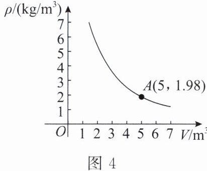 2. (跨学科)(2022 辽宁大连中考)密闭容器内有一定质量的二氧化碳,当容器的体积 $ V $(m^3)变化时,气体的密度 $ \rho $(kg/m^3)随之变化。已知密度 $ \rho $ 与体积 $ V $ 是反比例函数关系,其图象如图 4,当 $ V = 5 $ m^3 时,$ \rho = 1.98 $ kg/m^3。