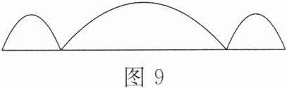 3. 如图9,三孔桥横截面的三个孔都呈抛物线形,左右两个抛物线是全等的,正常水位时,大孔水面宽度为$20m$,顶点距水面$6m$,小孔顶点距水面$4.5m$,当水位上涨至刚好淹没小孔时,大孔的水面宽度为( )。