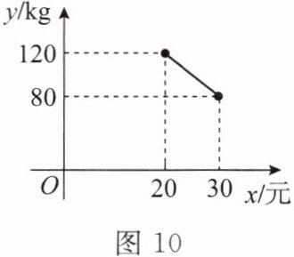 17. (16 分)草莓是一种深受大家喜爱的水果。某超市一段时间内每天调运一批成本价为每千克 20 元的草莓,以不低于成本价且不超过每千克 30 元的价格销售,每天销售草莓的数量 $ y $(kg)与每千克的售价 $ x $(元)之间的函数关系如图 10。