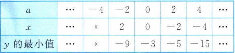【举一反三】 老师给出更多 $ a $ 的值,同学们求出对应的函数在 $ x $ 取何值时,$ y $ 的最小值。记录结果,并整理成下表: