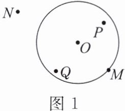 2. 如图1,已知$\odot O$的半径为3,平面内有一点到圆心$O$的距离为5,则此点可能是( )。