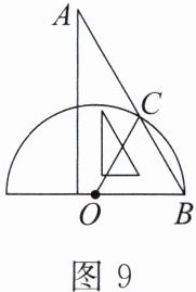 5. 将一块含有$60^{\circ}$角的三角尺,按图9的方式摆放在以点$O$为圆心的半圆形纸片上,三角尺的斜边$AB交半圆于点C$,则$\angle ACO$的度数为______。