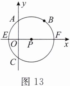 (2)如图62(见上页),连接PA,PC.$\because PE=PF=\frac{\sqrt{41}}{2}$,$OP=2$,$\therefore OE=PE-OP=\frac{\sqrt{41}}{2}-2$,$OF=OP+PF=2+\frac{\sqrt{41}}{2}$.$\therefore$点E的坐标为$(2-\frac{\sqrt{41}}{2},0)$,点F的坐标为$(2+\frac{\sqrt{41}}{2},0)$.在$Rt\triangle AOP$中,$OA=\sqrt{AP^{2}-OP^{2}}=\sqrt{(\frac{\sqrt{41}}{2})^{2}-2^{2}}=\frac{5}{2}$.$\therefore$点A的坐标为$(0,\frac{5}{2})$.同理,得点C的坐标为$(0,-\frac{5}{2})$.