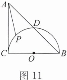 7. 如图11,在$Rt\triangle ABC$中,$\angle ACB = 90^{\circ}$,$AC = BC = 2$,以$BC为直径的半圆O交AB于点D$,$P是\overset{\frown}{CD}$上的一个动点,连接$AP$,则$AP$的最小值是______。