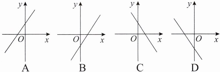 6. 已知反比例函数$y = \frac{k}{x}$的图象位于第二、四象限内,则一次函数$y = (3 - k)x + 3$的大致图象是( )。