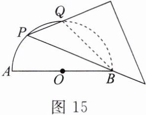 7. 如图15,将一块等腰直角三角尺放在以$AB为直径的半圆O$上,锐角顶点$P在半圆O$上,$\angle P的两边分别交半圆O于B$,$Q$两点. 连接$BQ$,若$AB = 2$,则$BQ$的长是______.