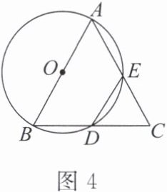 如图 4,已知在$\triangle ABC$中,$AB为\odot O$的直径,$BC$,$AC分别交\odot O于点D$,$E$,且$BD = DE$。