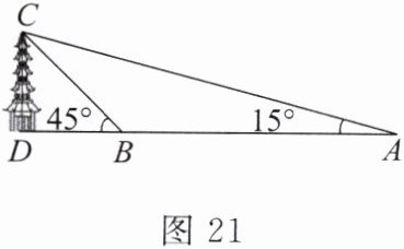 【综合应用】(2) 如图 21,小凤同学测量古塔 $CD$的高度,在 $A$处用测角仪测得塔顶 $C$的仰角为 $15^{\circ}$,又沿古塔的方向前行了 $100\ m$到达 $B$处,此时 $A$,$B$,$D$三点在一条直线上,在 $B处测得塔顶C$的仰角为 $45^{\circ}$。请用上述结论求古塔 $CD$的高度。(结果精确到 $0.1$,$\sqrt{3} \approx 1.732$,$\sin 15^{\circ} = \frac{\sqrt{6} - \sqrt{2}}{4}$)