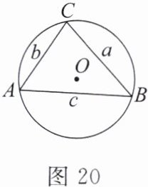 【探究活动】(1) 如图 20,在锐角三角形 $ABC$中,$a$,$b$,$c分别是\angle A$,$\angle B$,$\angle C$的对边,其外接圆半径为 $R$,那么$\frac{a}{\sin A}$____$\frac{b}{\sin B}$____$\frac{c}{\sin C}$(填“$>$”“$=$”或“$<$”),请说明理由。
