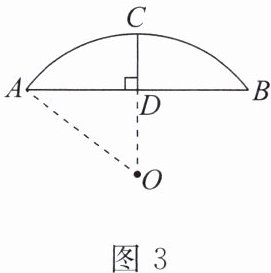 3. 某蔬菜基地的圆弧形蔬菜大棚的剖面如图 3 所示,已知 $AB = 16$ m,$OD = 6$ m,$OC⊥AB$ 于点 D,则 $AD = $______m,半径 $OA = $______m,$CD = $______m.