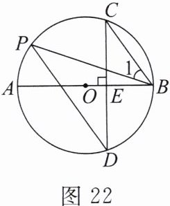 8. 如图 22,已知 AB 是⊙O 的直径,弦 $CD\perp AB$ 于点 E,点 P 在⊙O 上,$\angle 1= \angle C$.