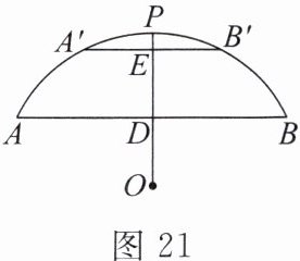 (2)已知当洪水泛滥到跨度小于等于 30 m 时,需要采取紧急措施. 如图 21,当洪水泛滥到跨度为 $A'B'$ 时,拱顶离水面只有 4 m,即 $PE = 4$ m,此时是否需要采取紧急措施?