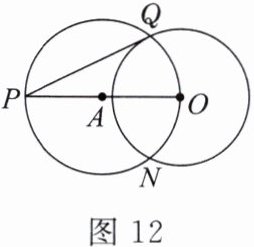 2. 如图 12,$ P $ 为 $ \odot O $ 外一点,连接 $ OP $,以 $ OP $ 为直径作 $ \odot A $,两圆交于点 $ Q $,$ N $,连接 $ PQ $,可得 $ PQ $ 是 $ \odot O $ 的切线,则判定其为切线的依据是( ).