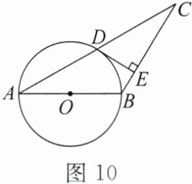 4. 如图 10,$ AB $ 是 $ \odot O $ 的直径,$ AC $ 的中点 $ D $ 在 $ \odot O $ 上,$ DE \perp BC $ 于点 $ E $.