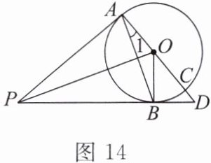 5. 如图14,PA,PB是⊙O的切线,A,B为切点,AC是⊙O的直径,AC,PB的延长线相交于点D,∠1= 20°.求∠APB的度数.