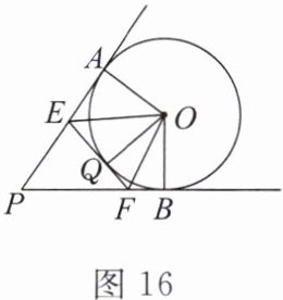 7. 如图16,已知PA,PB是⊙O的切线,切点分别是A,B,PA= 12 cm,∠P= 56°,Q为⌢AB上一点,过点Q作⊙O的切线,分别交PA,PB于点E,F.