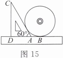6. 将一把直尺,一副含60°角的直角三角尺和一个光盘按图15的方式摆放,直角三角尺的直角边AD与直尺的一边重合,光盘与直角三角尺的斜边AC相切,与直尺的一边相切于点B,且AB= 3 cm,则光盘的直径是( ).