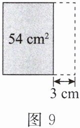 1. 如图 9,从一块正方形木板上锯掉 3 cm 宽的矩形木条,剩下(阴影部分)的面积是$ 54 cm^2。$设原来这块木板的边长为 x cm,则根据题意可列方程为( )。