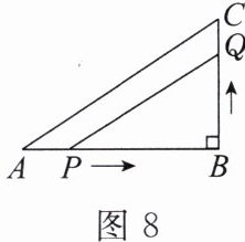 3. 如图 8,在 Rt△ABC 中,∠B = 90°,AB = 16 cm,BC = 12 cm。点 P 从点 A 出发,沿 AB 边以 1 cm/s 的速度向点 B 移动;点 Q 从点 B 出发,沿 BC 边以 2 cm/s 的速度向点 C 移动。P,Q 两点同时出发,点 Q 移动到点 C 时两点停止移动。在移动过程中,是否存在某一时刻,使△PBQ 的面积等于△ABC 面积的 $\frac{2}{3}$?若存在,则请求出移动时间;若不存在,则请说明理由。