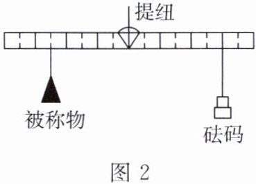 3. (数学文化)(2022 江苏镇江中考)《九章算术》中记载,战国时期的铜衡杆,其形式既不同于天平衡杆,也不同于称杆。衡杆正中有拱肩提纽和穿线孔,一面刻有贯通上、下的等分线。用该衡杆称物,可以把被称物与砝码放在提纽两边不同位置的刻线上,这样,用同一个砝码就可以称出质量大于它一倍或几倍的物体的质量。图 2 为铜衡杆的使用示意图,此时被称物质量是砝码质量的______倍。