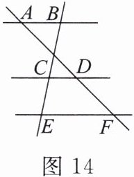3. 如图 14,已知 $ AB // CD // EF $,$ \frac{AD}{AF} = \frac{3}{5} $,$ BE = 12 $,则 $ CE $ 的长为( )。