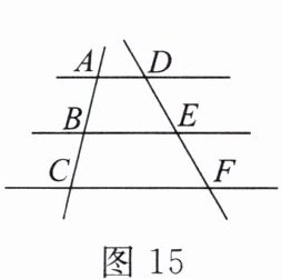 4. 如图 15,已知 $ AD // BE // CF $,且 $ AB = 2 $,$ DE = EF $,则 $ BC $ 的长为______。