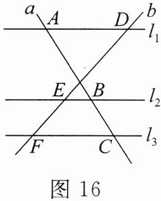 5. 如图 16,直线 $ l_{1} // l_{2} // l_{3} $,另两条直线 $ a $,$ b $ 分别交 $ l_{1} $,$ l_{2} $,$ l_{3} $ 于点 $ A $,$ B $,$ C $ 和点 $ D $,$ E $,$ F $,且 $ AB = 3 $,$ DE = 4 $,$ EF = 2 $。求 $ AC $ 的长。