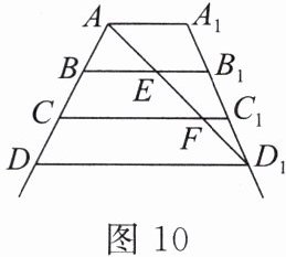 3. 图 10 是一架梯子的示意图,其中,$ AA_{1} // BB_{1} // CC_{1} // DD_{1} $,且 $ AB = BC = CD $。为使梯子更稳固,在 $ A $,$ D_{1} $ 两处之间加绑一条安全绳(线段 $ AD_{1} $),量得 $ AE $ 的长为 $ 0.4 $ m,则 $ AD_{1} $ 的长为______ m。
