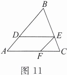 4. 如图 11,在 $ \triangle ABC $ 中,点 $ D $,$ E $,$ F $ 分别在边 $ AB $,$ BC $,$ AC $ 上,且 $ DE // AC $,$ EF // AB $,$ BD = 2AD $。求 $ \frac{CF}{AF} $ 的值。