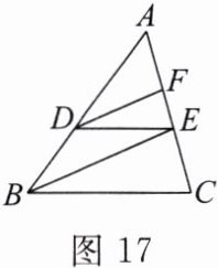 6. 如图 17,在 $ \triangle ABC $ 中,$ D $ 是 $ AB $ 上一点,且 $ \frac{AD}{DB} = \frac{3}{2} $,$ E $,$ F $ 是 $ AC $ 上的点,且 $ DE // BC $,$ DF // BE $,$ AF = 9 $。求 $ EC $ 的长。